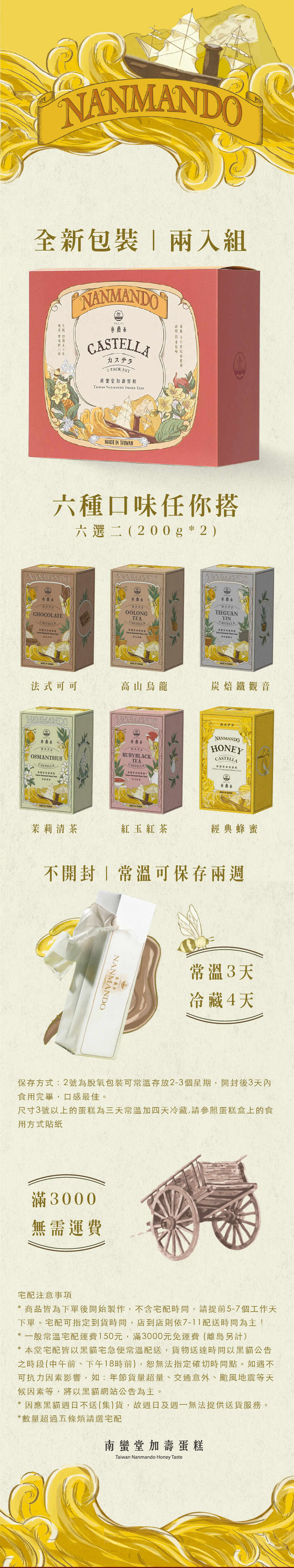 * 本堂宅配皆以黑貓宅急便常溫配送,貨物送達時間以黑貓公告之時段(中午前、下午18時前),恕無法指定確切時間點。如遇不可抗力因素影響,如:年節貨量超量、交通意外、颱風地震等天候因素等,將以黑貓網站公告為主。